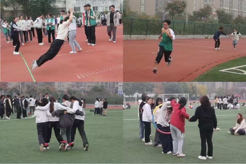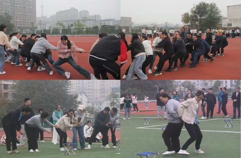 在运动场上,4×100米混合接力赛的赛道瞬间成为焦点。参赛运动员们仿若猎豹出击般迅猛矫健,起跑、加速一气呵成。当最后一名接力选手在冲过终点线的一刹那,时间仿佛定格,全场爆发出雷鸣般的欢呼。在教职工组,四人五足无疑是最具有欢乐氛围的项目之一。随着一声清脆的哨响,平日里沉稳庄重的教师们瞬间变身成为赛场上活力四射的运动员。“一二、一二……”整齐的口号声在运动场上空回荡,教师选手们的身体微微前倾,手臂紧紧地搭在彼此的肩上,每一步都迈得坚定有力,每个人的脸上都洋溢着兴奋的神情。旁边的观众也被他们的热情所感染,不断为他们呐喊助威。师生友谊拔河赛同样精彩纷呈。比赛中,师生们眼神坚定,双脚用力蹬地,绳子在双方的拉扯下如同一条紧绷的弹簧时而向左,时而向右,观众也被他们的激情所感染,不断为他们呐喊助威。