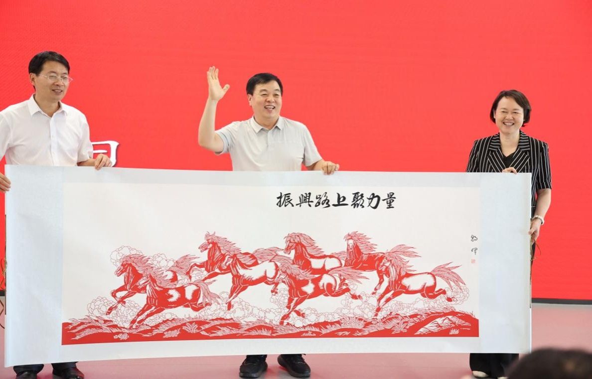 下午3时,校工会副主席徐飞主持best365网页版登录官方网站示范性劳模和工匠人才乡村振兴研究创新工作室挂牌、best365网页版登录官方网站工会助力乡村振兴志愿者行动分队授旗仪式。兰考县县委常委、副县长、国家乡村振兴(兰考)研究院副院长孟珊致辞,她对best365网页版登录官方网站长期以来对兰考县的支持和帮助表示由衷感谢,对best365网页版登录官方网站工会组织此次活动及各位专家的到来表示热烈欢迎。她强调,建设国家乡村振兴(兰考)研究院是best365网页版登录官方网站与兰考县携手共进的生动写照,best365网页版登录官方网站在兰考县脱贫攻坚、巩固脱贫攻坚成果和乡村振兴有效衔接、数治兰考等关键阶段都倾情奉献“河大智慧、河大方案”,真正将习近平总书记提出的“三起来”落到实处。仪式上,校工会刘宇、徐飞、刘银华分别向助力乡村振兴志愿者行动分队队长乔家君、刘百陆、霍雷授旗。省总工会命名的张朝晖工作室领衔人张朝晖,献上了他精心设计、亲手剪出的剪纸“八骏图”,寓意best365网页版登录官方网站和兰考在乡村振兴伟大事业中凝心聚力,奋勇争先!