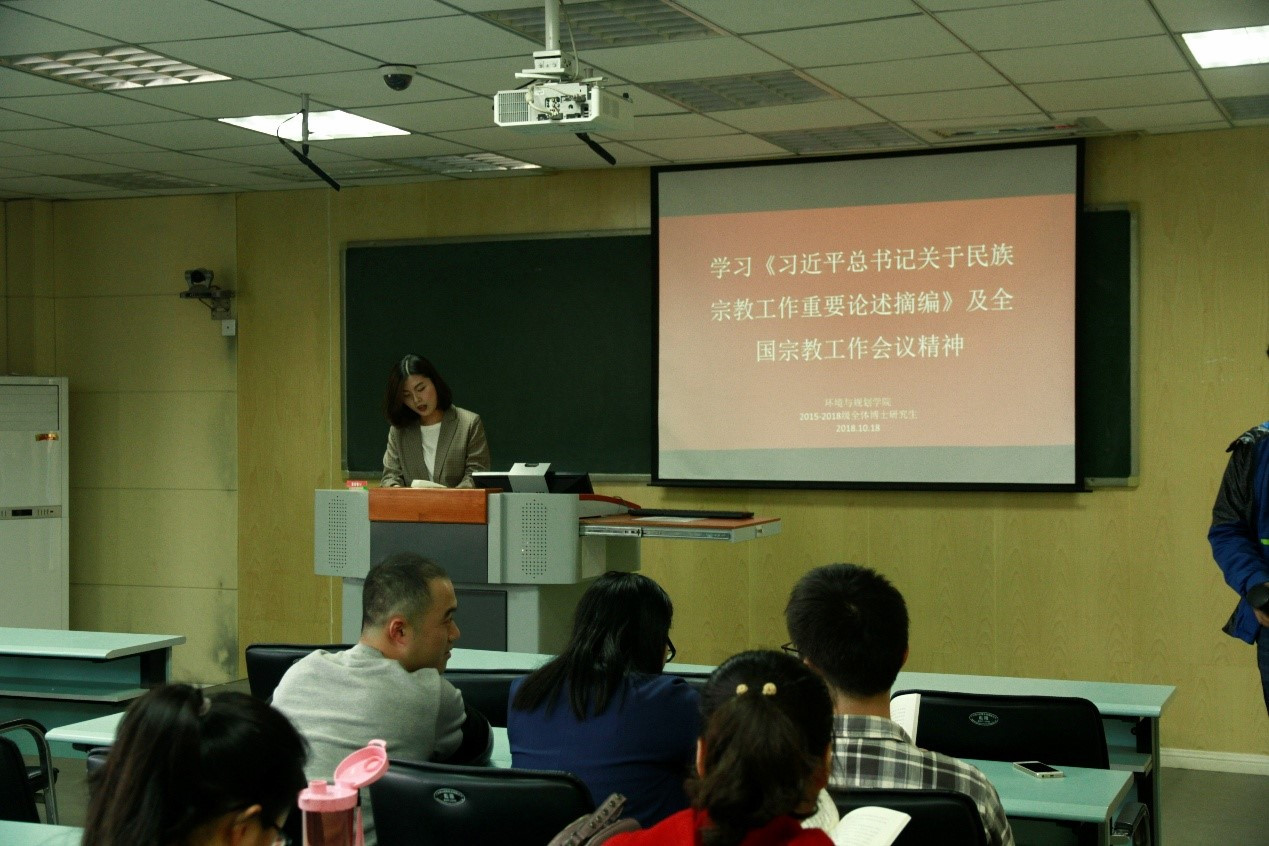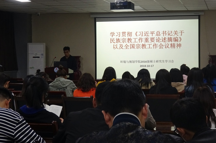 为认真学习贯彻落实全国宗教工作会议精神,2018年10月17日到18日,环境与规划学院全体硕博研究生,分别于学院二楼学术报告厅、520教室及502教室组织召开了关于学习贯彻《习近平总书记关于民族宗教工作重要论述摘编》及全国宗教工作会议精神主题活动,会议由各年级党支部主导,研究生会协助。