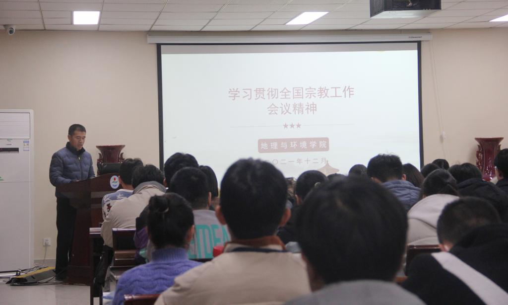 12月23日中午,best365网页版登录官方网站在地学楼二楼报告厅组织开展了全国宗教工作会议精神学习会,采取线上、线下相结合的方式进行,党委副书记徐小军、2021级辅导员屈利铭和本科生辅导员马利群出席会议,2019级、2020级和2021级全体学生及研究生代表参会。会议由团委书记、2019级辅导员赵越主持。