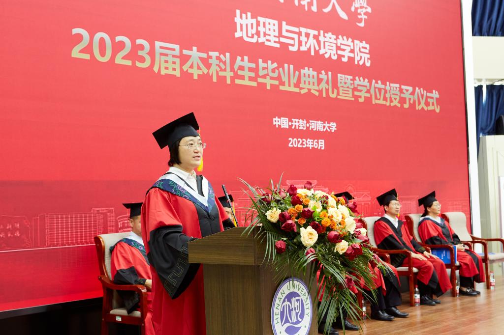 2023届本科毕业生代表金艺辰发言,对学校、学院、父母、师长表示诚挚的感谢。她说,回忆大学四年的成长,地理已成为她生命中的重要主题。但再多的言语也道不尽成长的收获,未来她会带着这些动人故事的风采,去开启新的人生篇章。在校生代表、2020级环境科学专业赵璟琦发言,向即将离开母校的学长学姐送上最衷心的祝愿并感谢他们在学习生活上的关心和指导。祝愿他们的未来前途光明,承载着老师的殷切希望奋力前行。轻装策马青云路,人生从此驭长风。