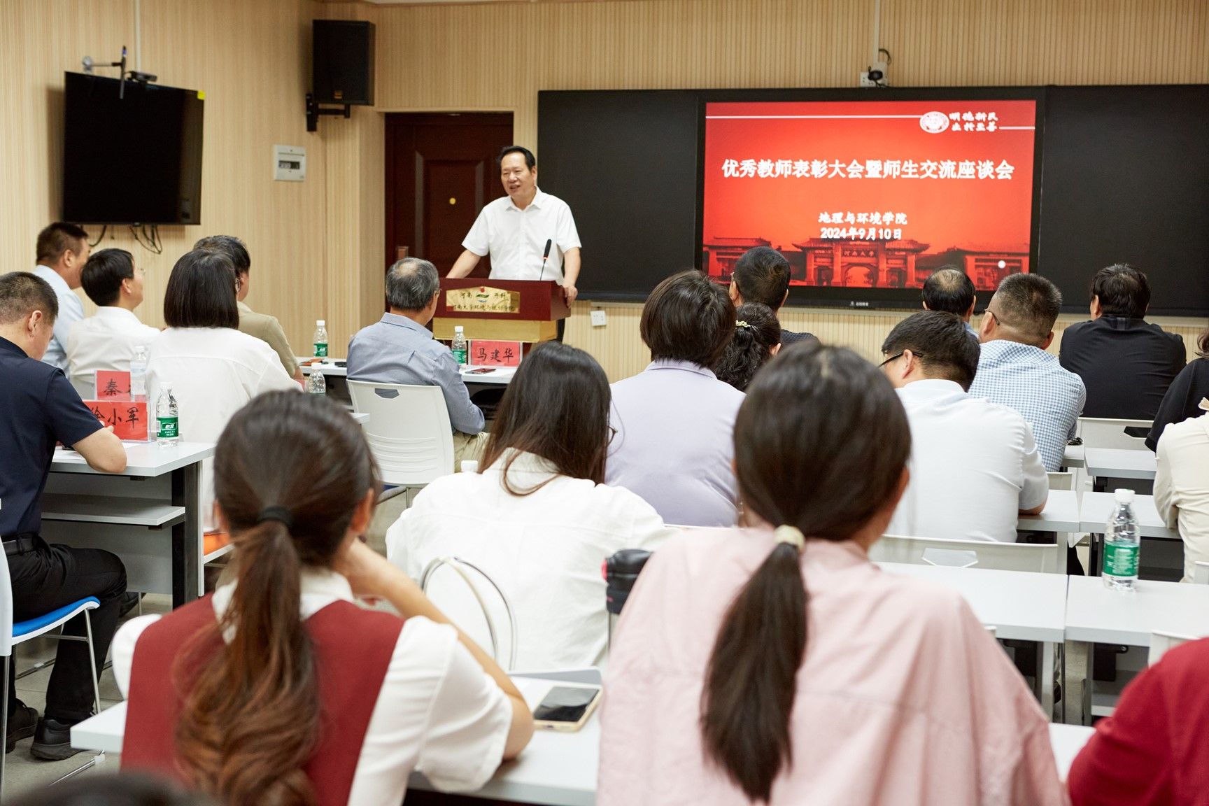 为进一步展现best365网页版登录官方网站教师立德树人、自信自强的精神面貌,弘扬优良师德传统,形成尊师重教的良好氛围,在我国第40个教师节来临之际,9月10日下午,best365网页版登录官方网站在环境与规划国家级实验教学示范中心101教室举办2024年度优秀教师表彰大会暨师生交流座谈会,交流从教心得,共话学院发展。学院领导班子成员、资深教师代表、学院2024年度优秀教师代表和学生代表参加。会议由学院副院长邱永宽主持。