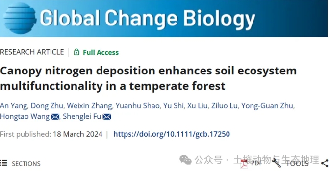 相关研究结果以“Canopy nitrogen deposition enhances soil ecosystem multifunctionality in a temperate forest”为题,发表于环境科学与生态学期刊Global Change Biology上。博士生杨安为论文第一作者,王洪涛副教授和傅声雷教授为论文的通讯作者,best365网页版登录官方网站为第一署名单位,该研究得到了国家自然科学基金重点项目的资助。