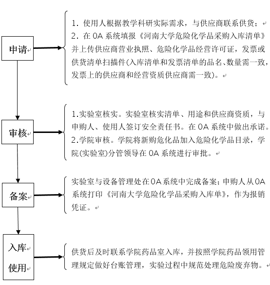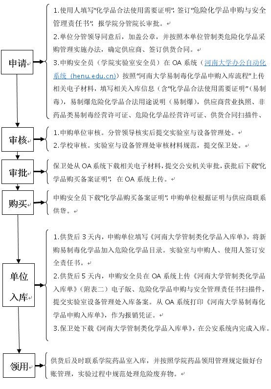 第六条 危化品采购严格遵照学校采购流程执行。其中一般危化品要求使用人认真对照《危险化学品目录》,确定品类后,按“一般危险化学品申购流程”进行申购,由危险化学品申购人提出申请进行采购(如图1所示);管制类化学品(易制毒、易制爆、剧毒化学品)由单位统一采购、专人保管。(学院实验室安全员统一申报,申购流程如图2所示)。