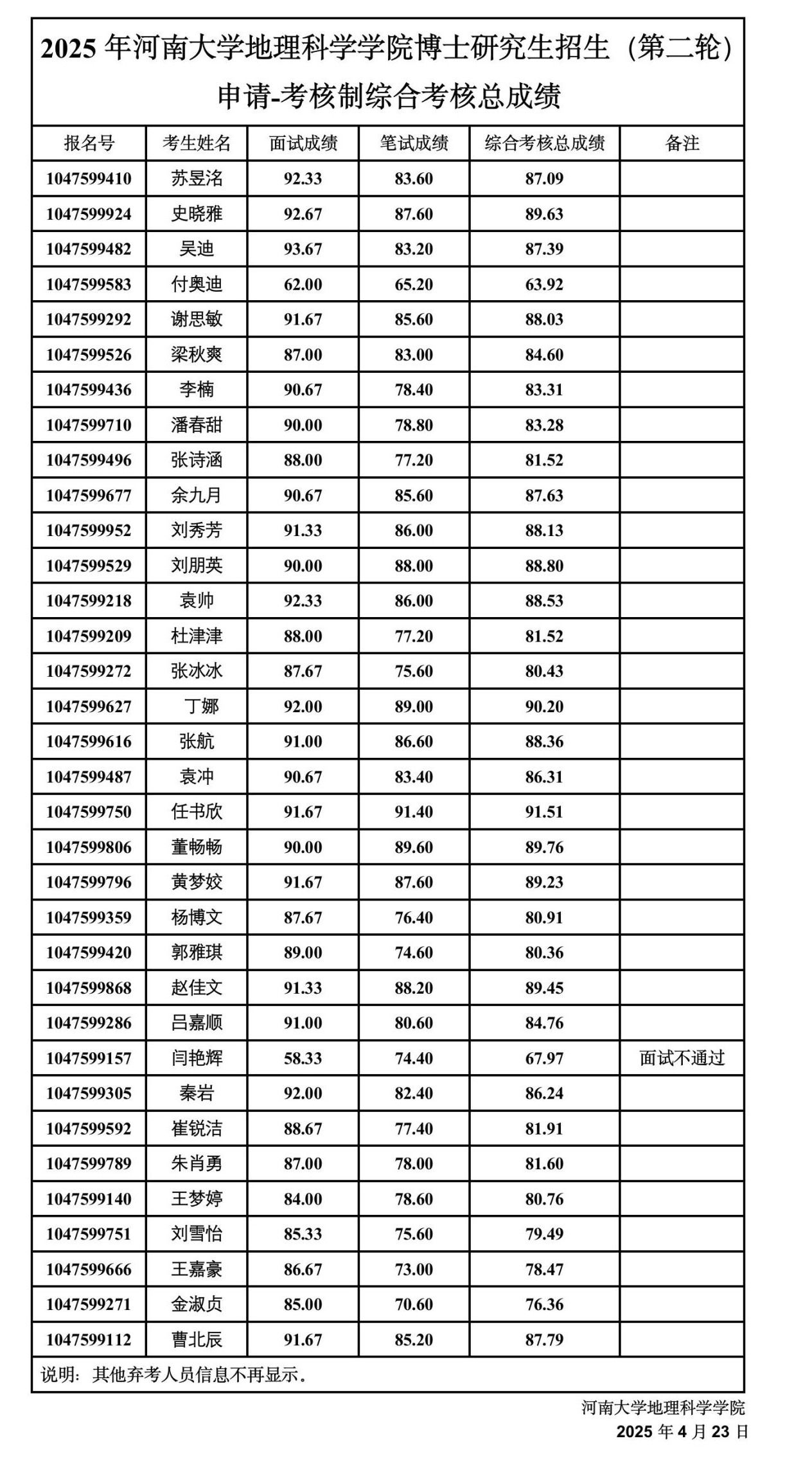 ​2025年best365网页版登录官方网站地理科学学院-博士研究生招生考试申请考核制(第二轮)综合考核总成绩
